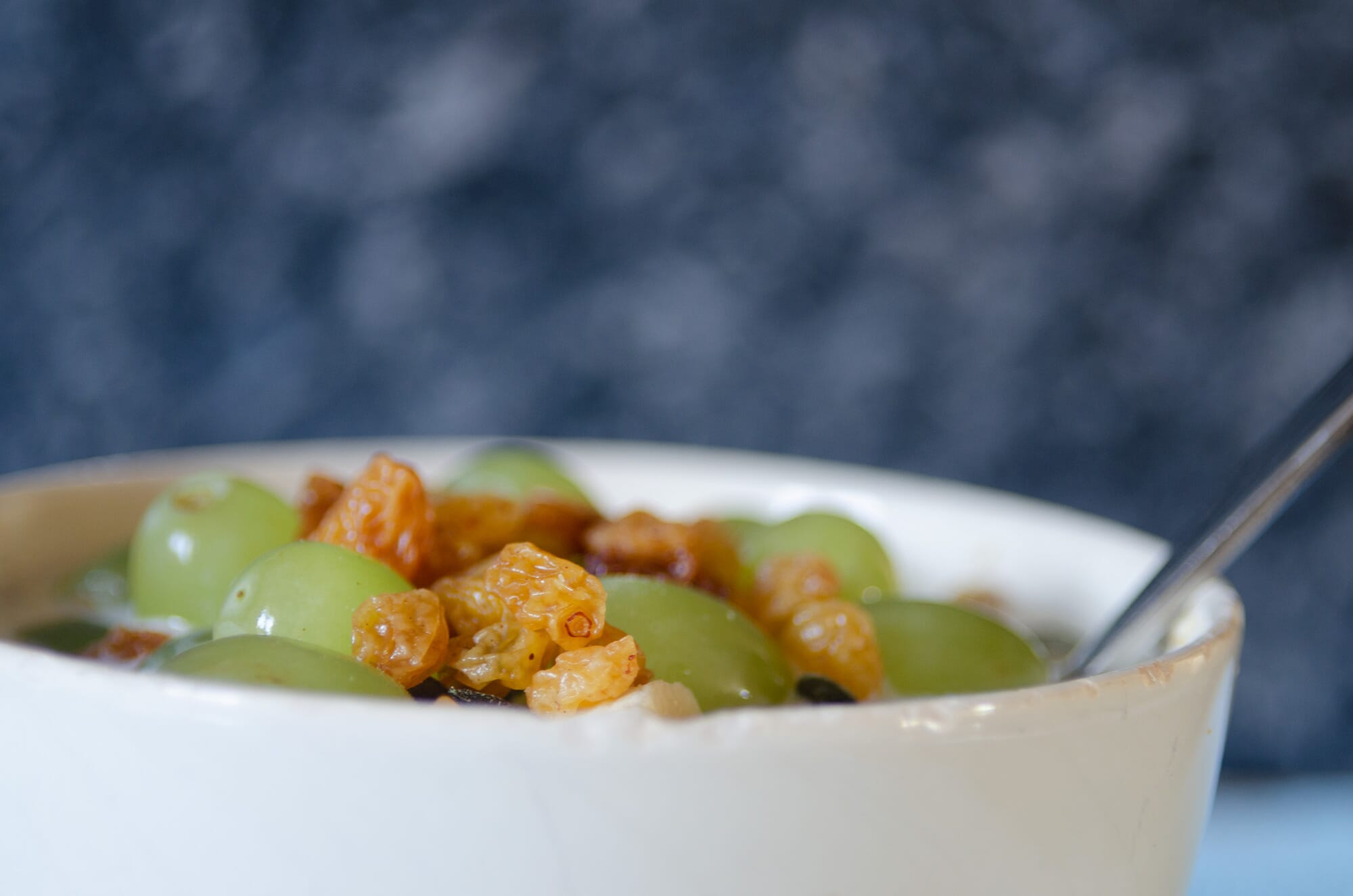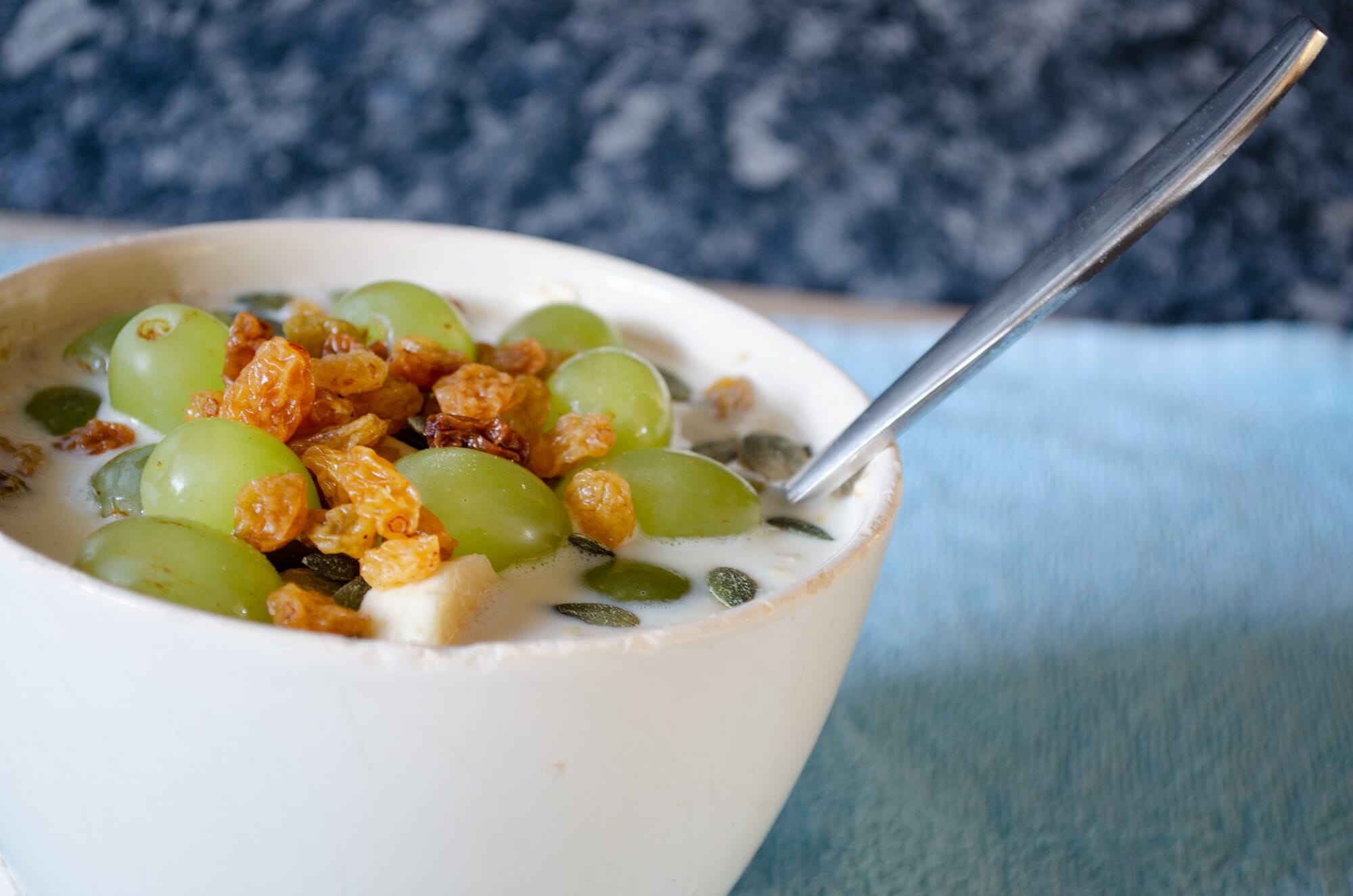 3) Snijd de banaan in stukjes en voeg deze toe samen met de druiven, pompoenpitten en een handje rozijnen.